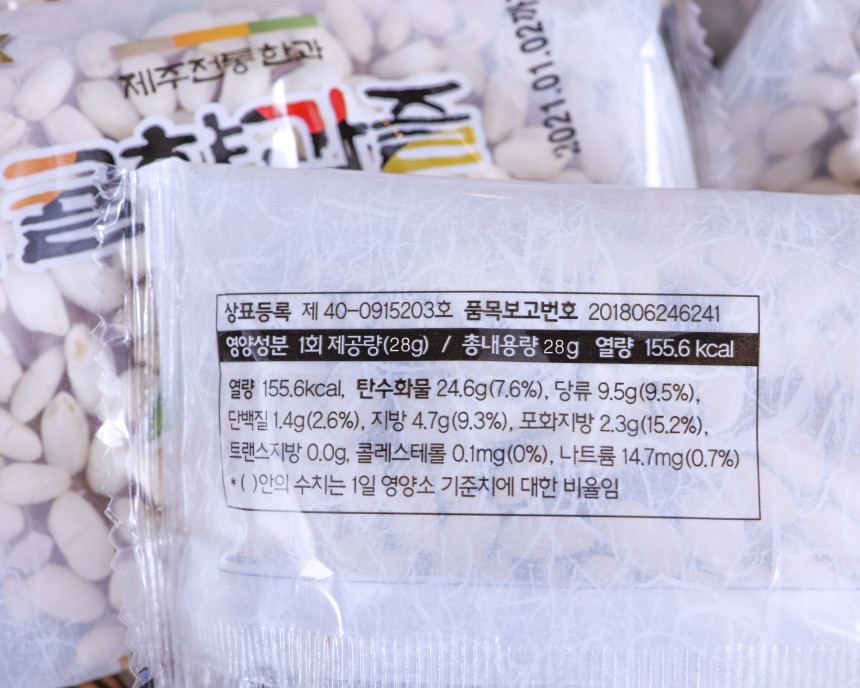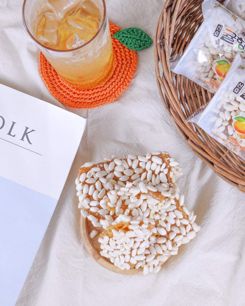 원재료명 및 함량 | 밀가루(밀:미국,호주산)37%, 감귤즙(감귤:제주산)14%, 물엿18%, 설탕18%, 쌀튀밥(쌀:국내산)12.8%, 소금0.2% [알레르기 유발물질:밀] |