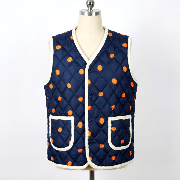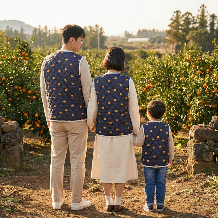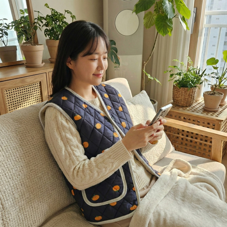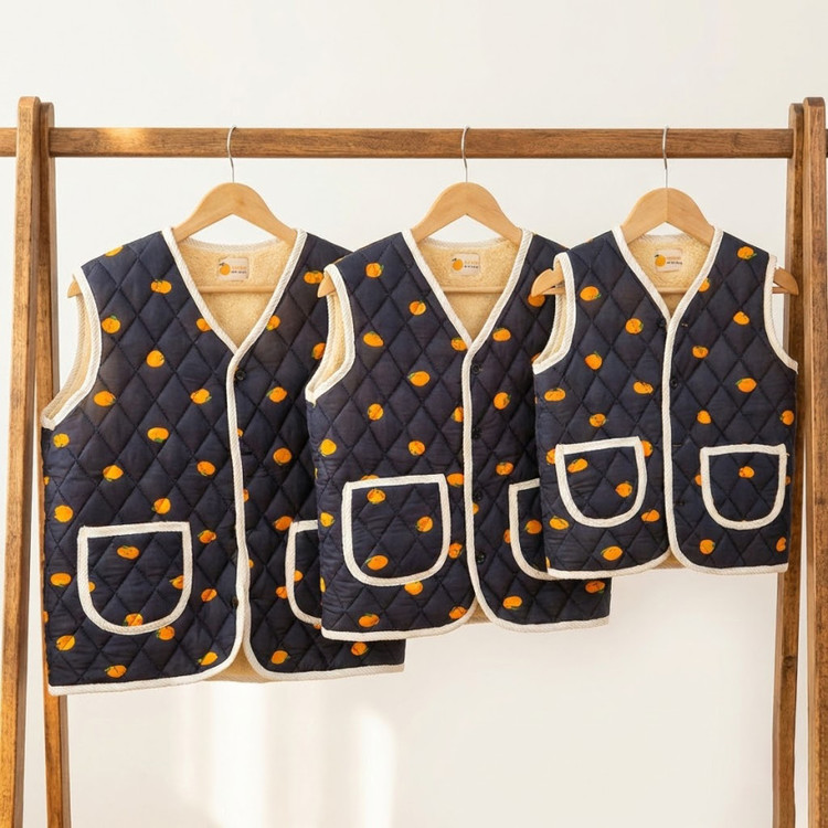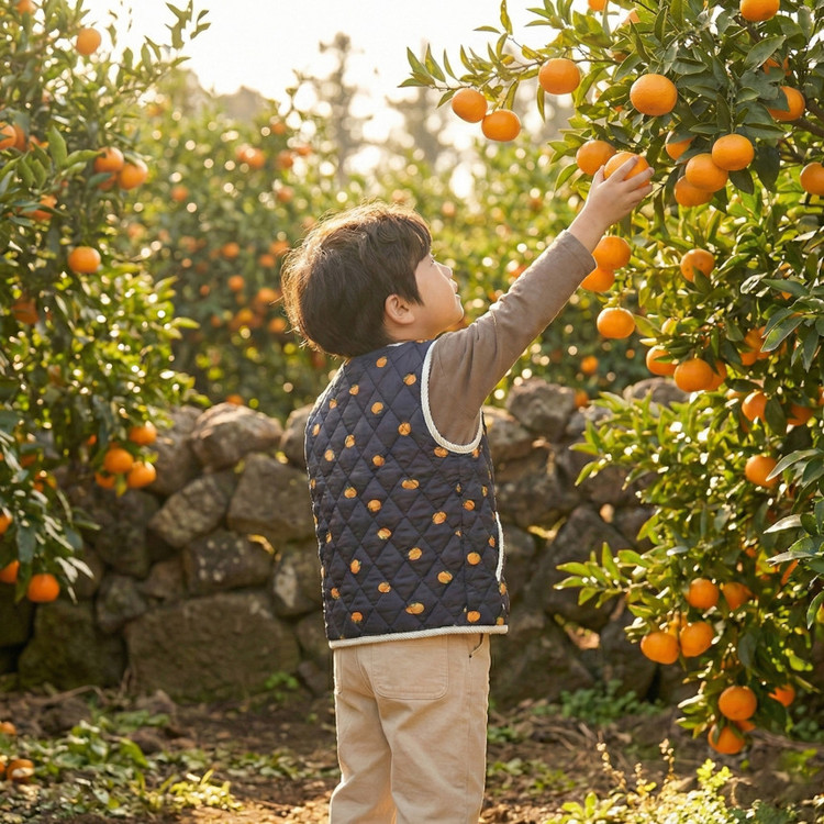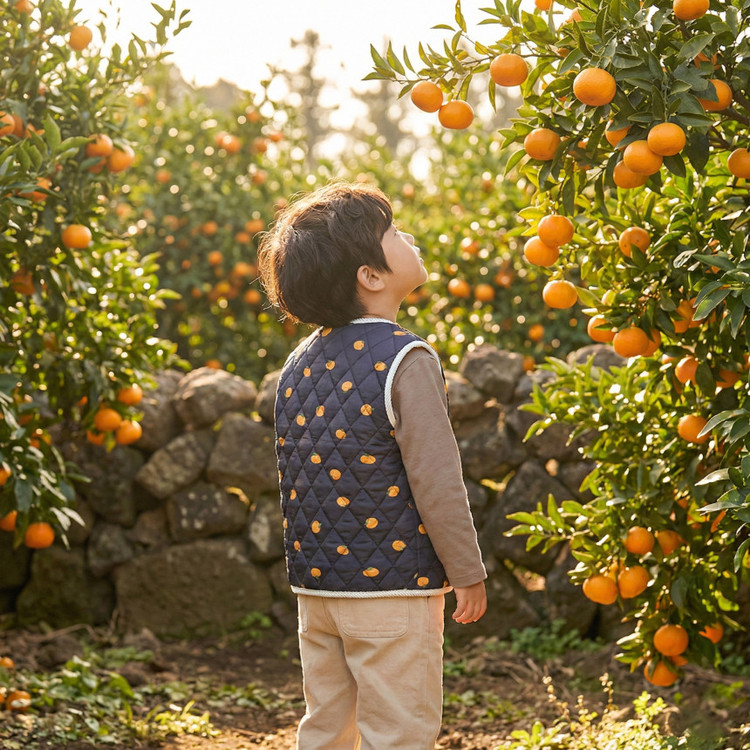 상큼발랄한 애기감귤 패턴과 포근한 누빔 김장조끼의 만남!